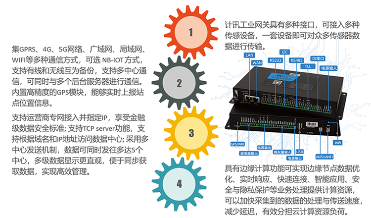 网络传输设备:主要设备可选计讯物联网网关TG451、边缘计算网关TG452、工业级物联网网关TG462,负责对数据进行传输,同时计讯网关还具备图像识别、视频分析、边缘计算功能,使用5G/4G无线网络将数据传输至管理中心。