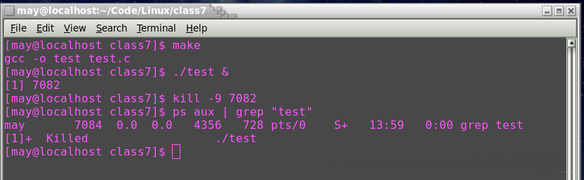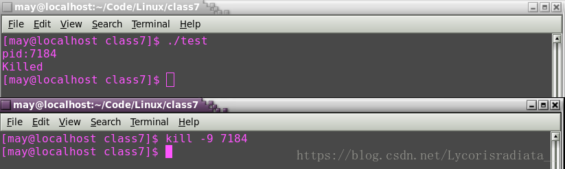 可以观察到,在运行一个终端时执行了test1操作。具体来说,在这个操作中使用了特定命令使得该程序能够打印出其进程ID(PID)。随后在另一个终端中执行了命令test时,通过传递命令行参数指定target进程的PID以及 intended signal为9号信号(SIGKILL)。经过一段时间后发现目标进程已无法响应并最终被kill信号所终止