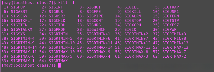 类似的,在操作系统的层次上也存在专门的信号处理机制。例如,在Linux操作系统中有多样的信号可供使用,并且我们可以利用命令 kill -l 来查看系统所定义的所有可用信号。