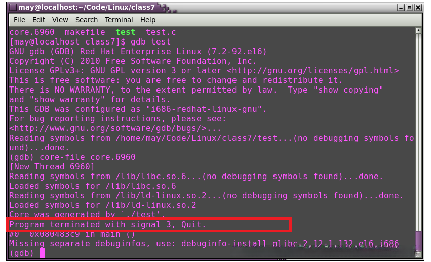 可以看到程序时因为收到了3号信号从而core dump了。