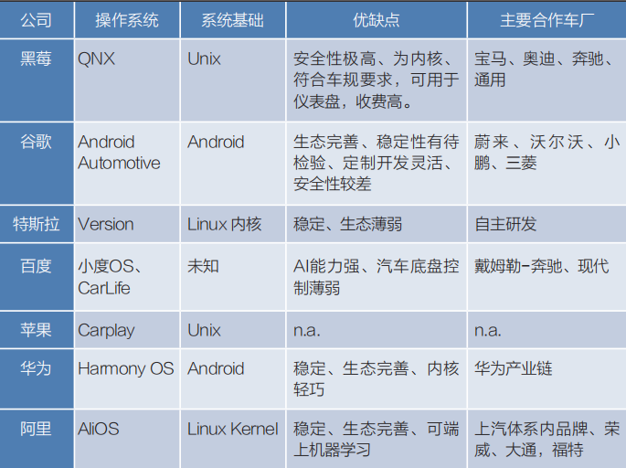 座舱OS方面,大多数车企、Tier1选择在开源底层OS(安卓/Linux)的基础上打造专属操作系统(ROM型),迅速建立软件生态;互联网企业凭自身的应用生态迅速切入汽车领域,构建生态体系。