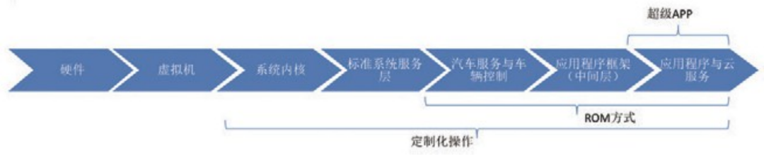 ③ROM型汽车操作系统:基于基础型操作系统(例如Linux、安卓)进行有限的定制化开发,不涉及系统内核更改,一般只修改操作系统自带的应用程序等。