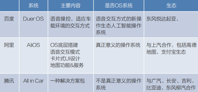 腾讯车联“All in Car”是腾讯车联网解决方案。AI in Car系统并不是真正意义上的OS,而更像一种解决方案,这种解决方案基于腾讯在安全、内容、社交、语音、大数据、AI等方面的优 势,根据车厂的实际需要按需输出。