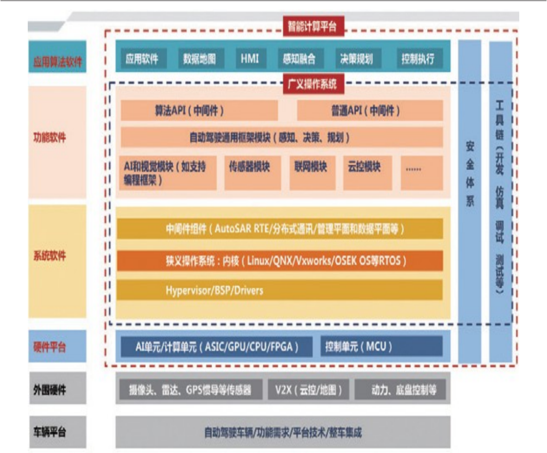 E/E架构升级包括硬件、软件、通信架构三大升级,(由下至上)芯片+操作系统+中间件+应用算法软件+数据构建核心技术闭环,汽车操作系统是软件定义汽车生态循环发展的灵魂。狭义操作系统专指内核(如Linux、QNX),提供内存管理、文件管理、CPU调度管理、输入输出管理功能;广义OS从下至上包 括从BSP、操作系统内核、中间件及库组件等硬件和上层应用之间的所有程序。从图3车载智能计算平台架构能清晰地看到广义操作系统和狭义操作系统的范围。