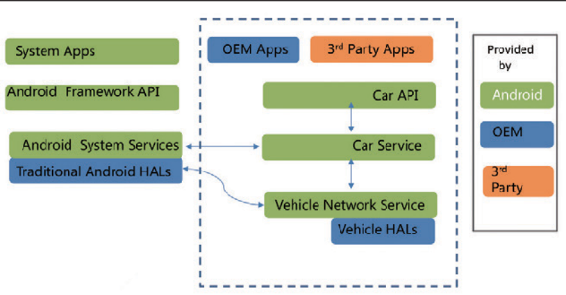 Android automotive OS是将手机Android的系统架构替换为与车相关的模块。包括: