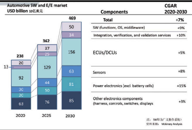 根据Mckinsey Analysis预测,2020年全球汽车广义操作系统(功能软件、狭义操作系统、中间件)市场规模达200亿美元,到2025年达370亿美元,复合年增长率(CGAR)增加13.1%;到2030年达500亿美元,十年CAGR增加9%。