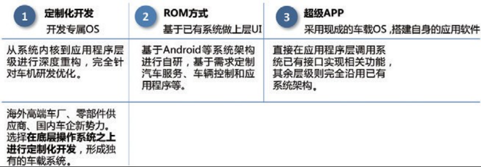 车企对车载OS布局根据战略格局以及自身实力划分为3种形式:①定制化开发;②ROM方式;③超级APP。