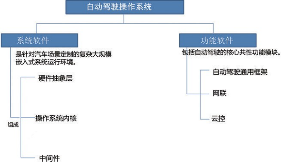 广义操作系统由功能软件和系统软件组成,系统软件是针对汽车场景定制的复杂大规模嵌入式系统运行环境。由硬件抽象层、操作系统内核和中间件组成。