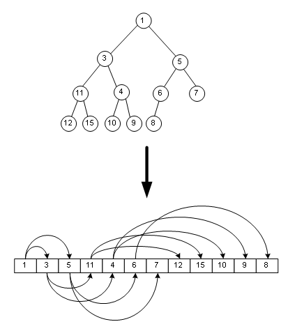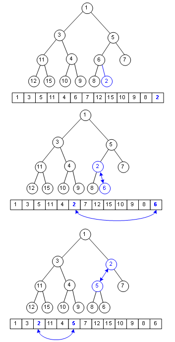 在上图所示的最小堆结构中插入一个键值为2的元素,在数组末尾加入这个元素后,并尽可能地将该元素向上移动至父节点位置。具体而言,在父节点满足键值不大于子节点键值的特点时,则会继续向上移动;直到无法再进行移动为止。由此可见,二叉堆插入操作的时间复杂度具有Ο(logn)这一特性。