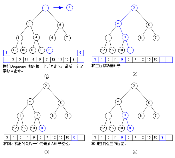 出队操作必然是出队列表的第一个元素(即最小元素),因此该位置成为空缺。我们需要对父节点进行重新排列,在此过程中从父节点两个子节点中选择较小的那个并将其向上移动到父节点的位置上。此时原来的那个子节点则成为新的父节点,并且该位置空置起来的状态实际上涉及对子堆结构进行调整。如此反复递归上移直至被移出的叶子节点。然后将数组末尾元素填入该空缺处
