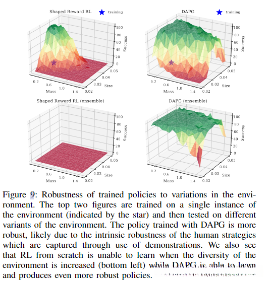 - 使用DAPG训练的策略更稳健,这可能是由于通过使用演示捕获的人类策略的内在稳健