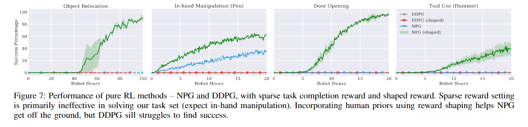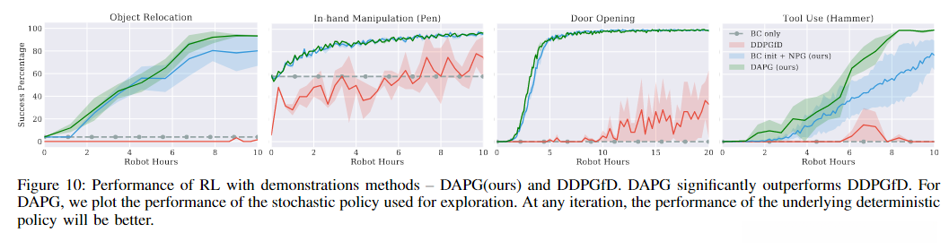 上图中,早在DDPGfD开始显示出进步的迹象之前,DAPG在所有任务中就令人信服地优于DDPGfD