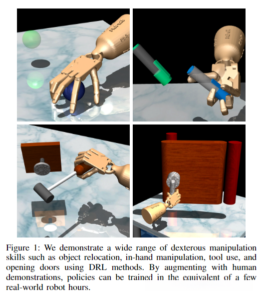 - 使用无模型DRL演示了高维类人五指手的灵巧操作,第一个演示这种复杂任务的无模型学习的经验结果(只在模拟环境中实验)
