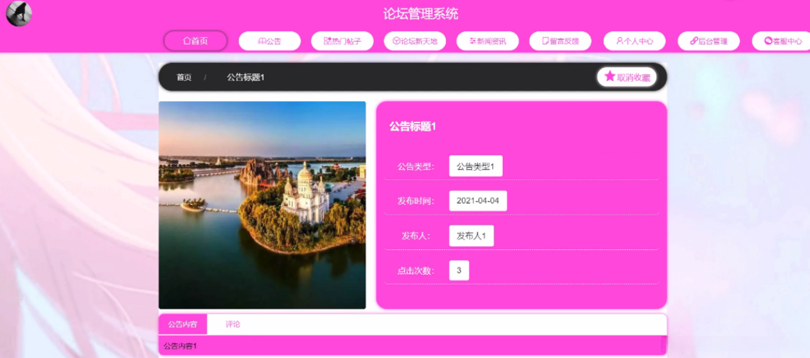 热门内容,在热门内容页面通过浏览标题信息以及分类信息,并查看发帖人相关信息等详细内容进行收藏操作(如图4-3所示)。在公告页面则通过浏览标题信息以及类型信息,并查看发帖人以及其他相关信息执行提交流程