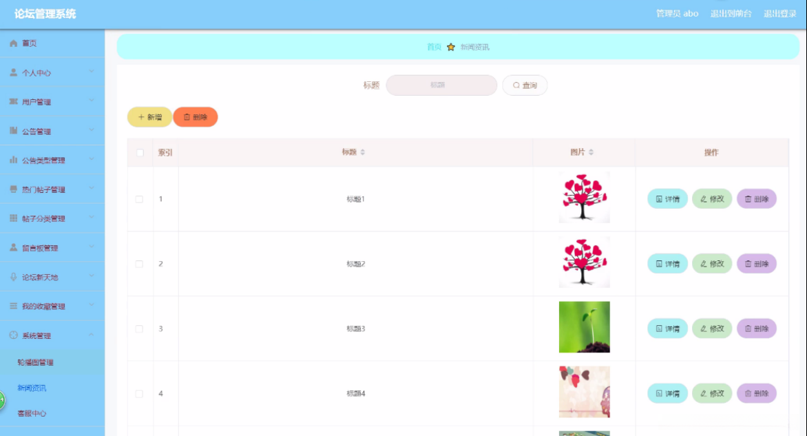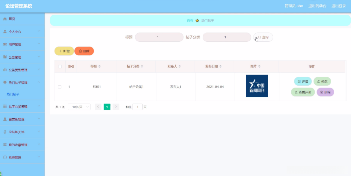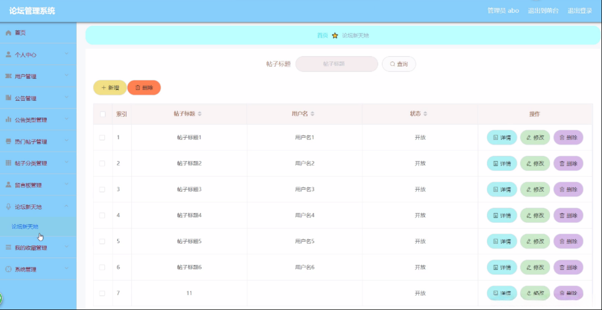 论坛新天地,在其页面上可浏览帖子标题、用户名以及状态等内容,并根据需求对现有论坛新天地进行详细信息查询、内容更新或删除等操作。