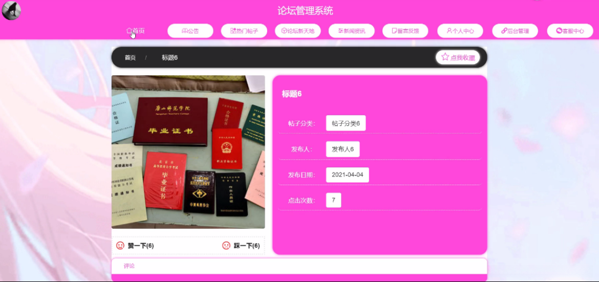 用户登录进入论坛管理系统可以查看首页、个人中心等内容。