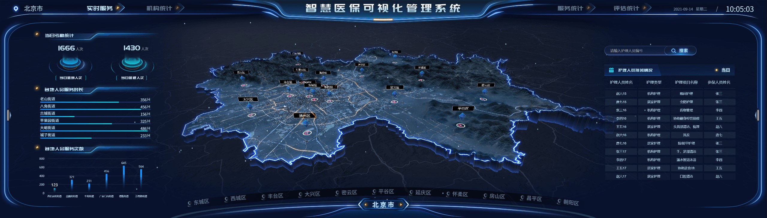 实时服务展示了医保服务的实时数据和服务人员实时点位数据,通过地区菜单可以切换到不同的子区域,页面数据会根据区域选择进行数据联动,每个服务人员标记可以通过点击进行互动,或者也可以通过搜索定位到某一个具体的服务人员,从而查看更详细的数据。