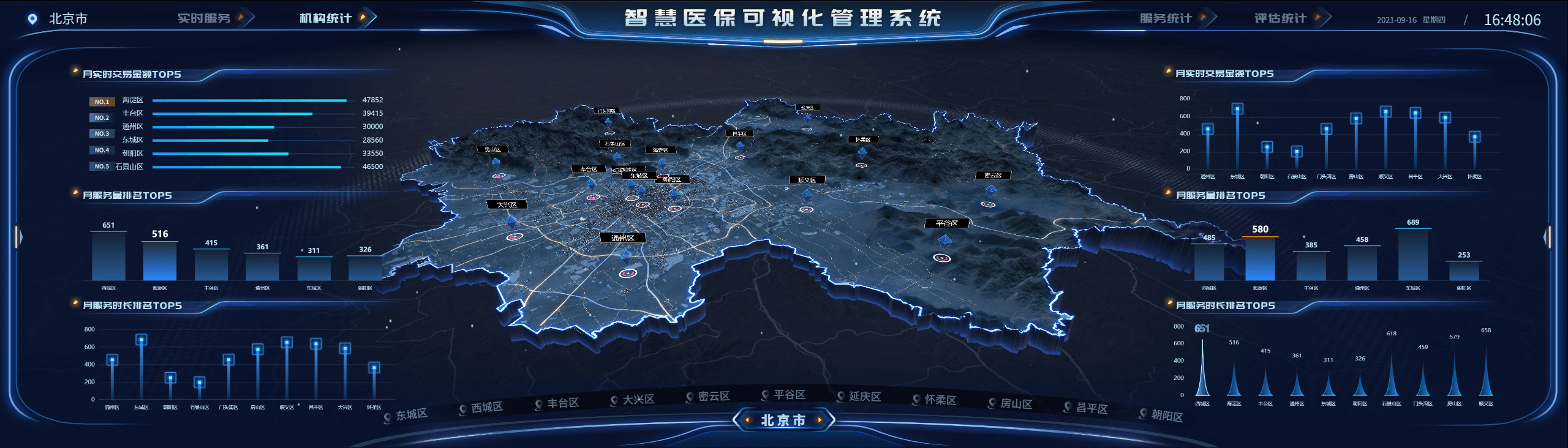 机构统计展示了医保机构的实时数据和医保机构的点位分布。通过地区菜单可以切换到不同的子区域,数据会根据区域选择进行数据联动,每个机构标记可以通过点击进行互动,从而查看更详细的机构信息。