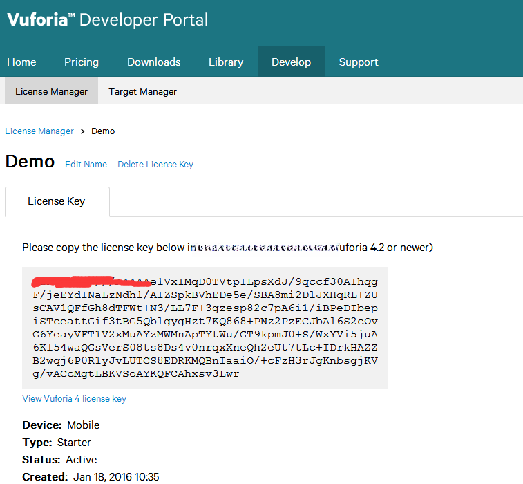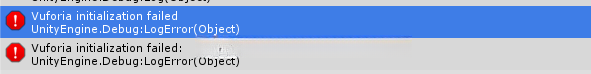 由于App License Key填写错误,到vuforia官网申请正确的Key填写进去。
