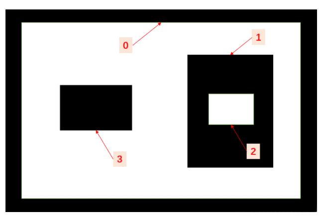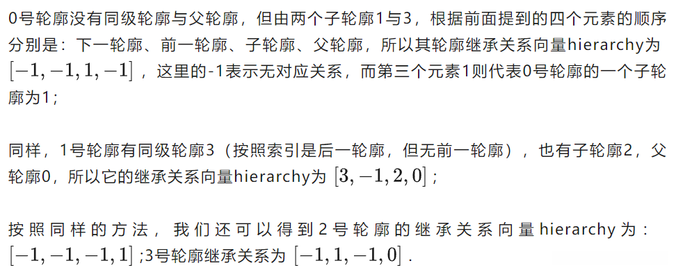 上面图片中,是一张图片中的所有轮廓,分别用序号0、1、2、3来表示,其中0有两个子轮廓,分别是1和3,而1则有一个父轮廓也有一个子轮廓,分别是0与2,它们的继承关系基本上就是这样,我们再做进一步的分析: