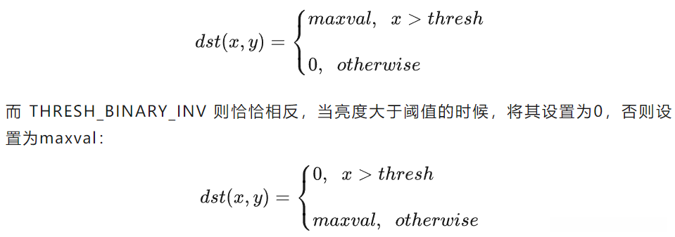同样,这个函数前两个参数分别为输入、输出参数;第三个参数thresh为设定的阈值;第四个参数maxval为设置的最大值,一般选取255;第五个参数type为阈值类型,表示当灰度值大于(或小于)阈值时将该灰度值赋成的值,其中最常用的有两个,分别是THRESH_BINARY,THRESH_BINARY_INV: