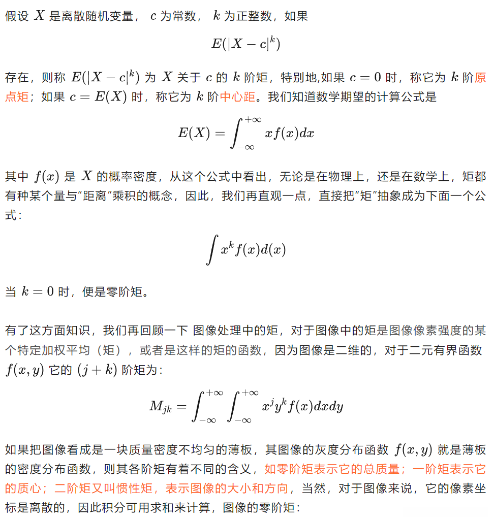 再来说下moments这个函数,其实moment在物理学中表示“力矩”的感念,“矩”在物理学中是表示距离和物理量乘积的物理量,表示物体的空间分布(至于汉语为什么把它翻译成矩这个字,我也不太明白,不知道是不是李善兰翻译的)。而在数学中,“矩”是概率论中的一个名词,它的本质是数学期望,我们从它的定义中就可以看出: