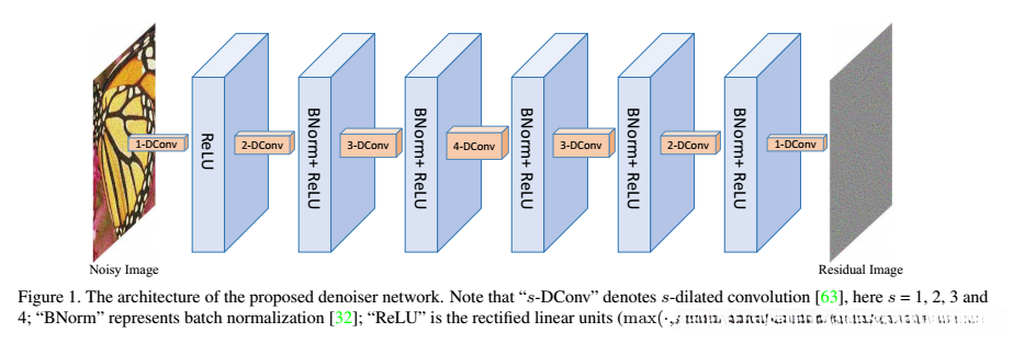 CNN去噪器模型如上图,由七层组成,含三种blocks,分别是:第一个“dilated Convolution+Relu”,中间五个“dilated Convolution+BN+Relu”,最后一层“dilated Convolution”。其中空洞因子(dilated factors,3×3)被依次设置为,1,2,3,4,3,2,1。每一个中间层的feature maps个数均为64.