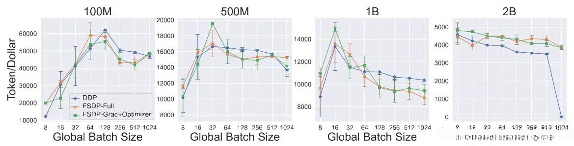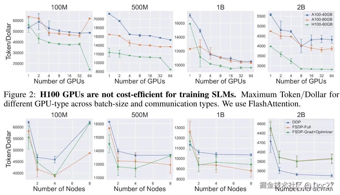 图3:DDP是训练大型语言模型(SLMs)的最佳方案。不同GPU节点在A100-80GB上跨不同批量大小的最大Token/美元。我们在模型中使用了FlashAttention。对于单个节点,我们使用了2、4和8个GPU,而对于2和4个节点,我们分别使用了16和32个GPU。