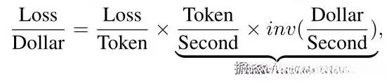 1$ . 其中,Second 是硬件和基础设施的成本,通过平均来自不同云提供商的公开价格来提取每种硬件配置的成本(见附录 A)。我们的分析结果提供了 $\frac{\text{ Token }}{\text{ Dollar }}$ 定律,结合损失缩放定律可以用来找到达到目标损失的最小成本。其他感兴趣的指标包括 CPU/GPU 利用率和内存带宽使用情况,我们将其留待未来的工作。我们将在下面报告 $\frac{\text{ Token }}{\text{ Dollar }}$ 在各种设置中的情况,其中 $1\mathrm{k}$ 表示训练 $1\mathrm{k}$ 个 token 的成本为