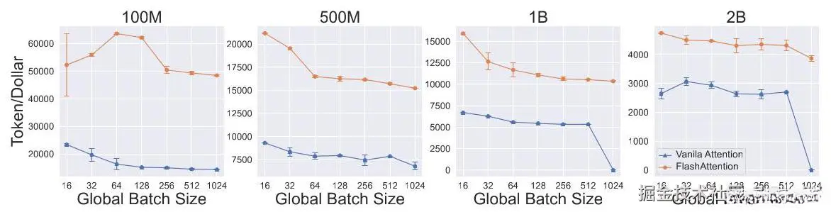 Figure 1: FlashAttention is more cost-efficient for smaller models. Maximum Token/Dollar across GPU-types, GPU-number, and communication type when we use FlashAttention. FlashAttention shows a significant Token/Dollar improvement over vanilla attention in smaller models and batch sizes. OOM runs are shown with 0 . Token/Dollar = 1\mathrm{k} means training for 1\mathrm{k} tokens costs
