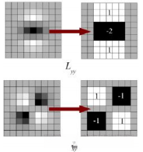当执行卷积运算时, 可以借助积分图像. 其显著优势在于, 在任何给定窗口内求取所有像素之和的过程中, 所需的时间与该窗口尺寸无关. 这使得盒子滤波器成为一个高效的方法, 并且可以在多尺度空间中实现同一操作. 同样地, 在使用SURF算法时, 在Hessian矩阵二阶导数行列式的平方根处检测关键点的位置和尺度特征.