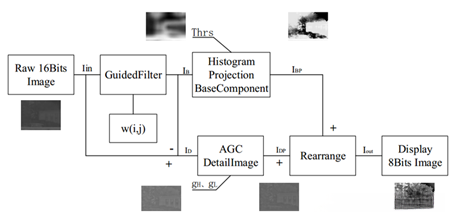 红外图像具有广 dynamic range(DR),特别是在利用高精度数字采集电路捕获制冷探测器信号后,在实际应用中难以直接形成清晰的图像。仅对 raw data (14-bit) 进行简单的 digital contrast enhancement会严重损害图像细节部分。传统的增强方法主要依赖于 classic histogram processing techniques, 包括直方图均衡化 (histogram equalization)、直方图投影技术 (histogram projection technique) 和平顶 Histogram 平滑化处理 (平台平滑化处理),但这些方法容易导致过补偿现象出现、会使噪声在平坦区域中被放大以及导致目标物体表面呈现偏白现象等不良效果。鉴于此,在本设计中提出了一种新的数字对比度增强算法(digital contrast enhancement algorithm),其具体流程如下: