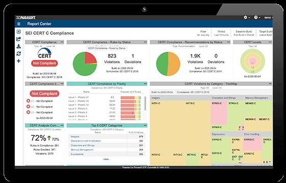 连同完整的CERT规则集,Parasoft独特的合规性报告可动态查看开发过程。交互式报表和自定义的仪表板可提供对CERT符合状态结果的不同视图,并使用标准定义的措辞和分类,以使其更易于理解。