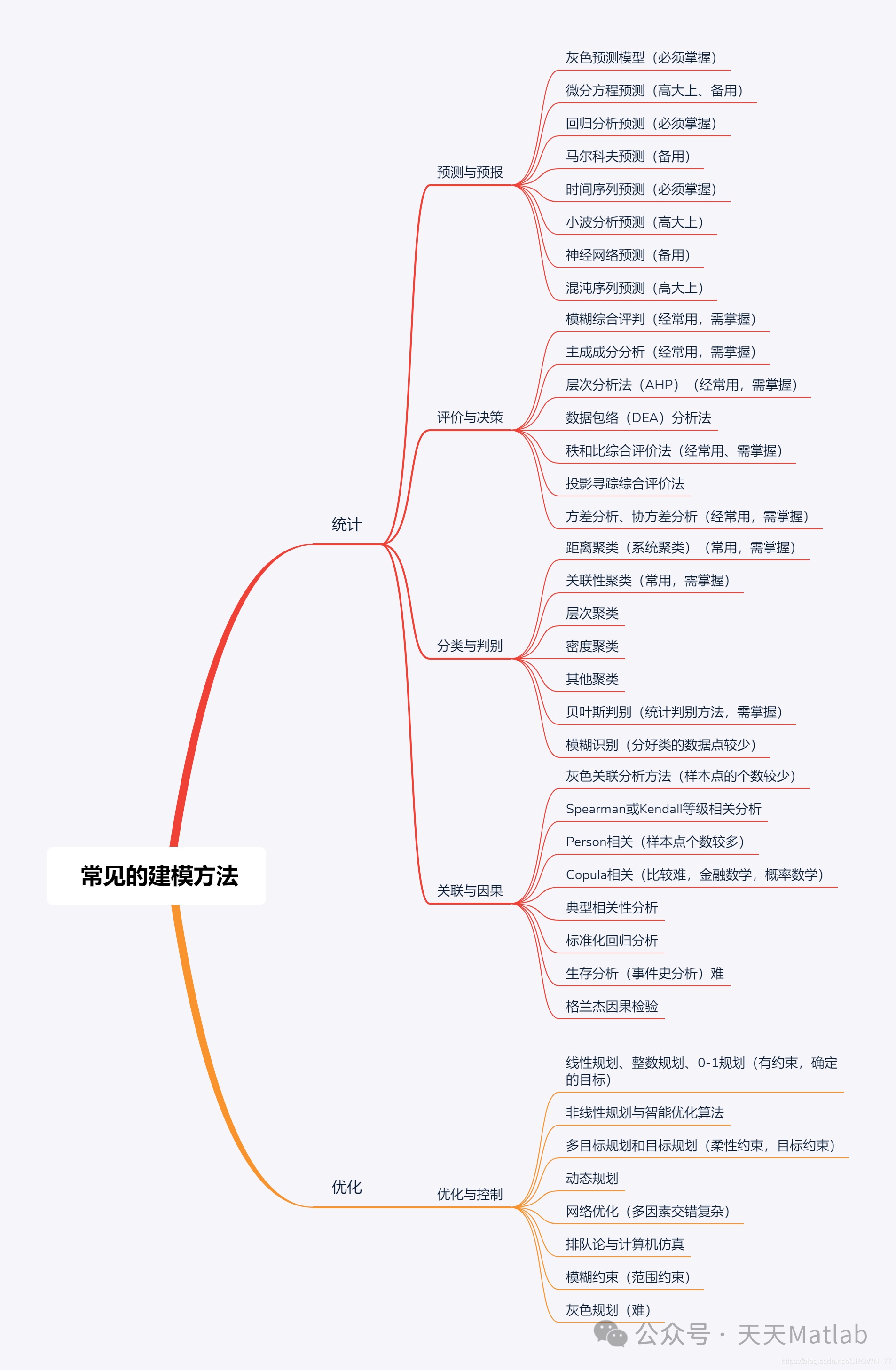 几何理论、现行代数、微积分、组合概率、统计(回归)分析、优化方法(规划)、图论与网络优化、综合评价、插值与拟合、差分计算、微分方程、排队论、模糊数学、随机决策、多目标决策、随机模拟、灰色系统理论、神经网络、时间序列、机理分析等方法。
