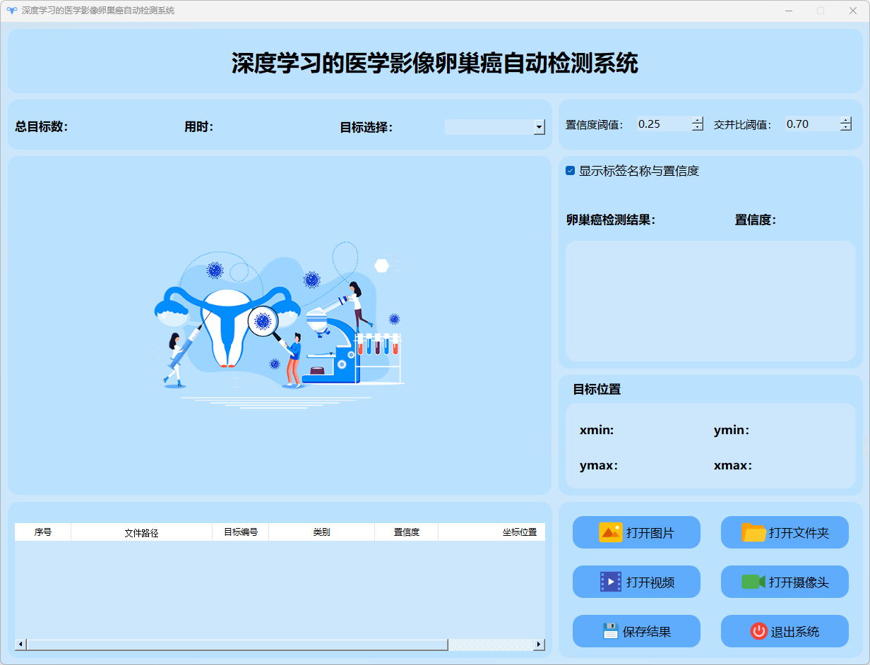该界面不仅展示了系统的多目标检测性能,在处理卵巢癌相关图像时表现出了较高的准确性,并对检测结果进行了详细的数据分析