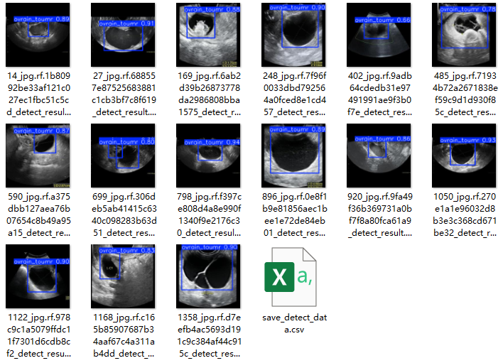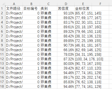 这张图记录了卵巢癌图像检测的一次测试结果,在涉及的时间、种类、置信度等方面进行了详细展示,并标示出目标位置信息。用户可以通过界面查看并分析这些数据以提高该系统在卵巢癌图像目标检测中的性能水平。