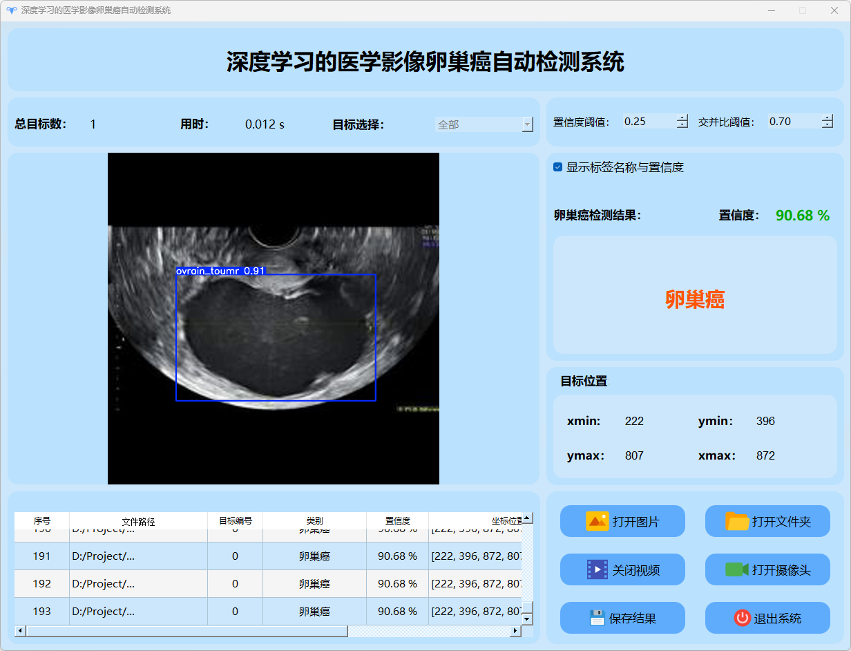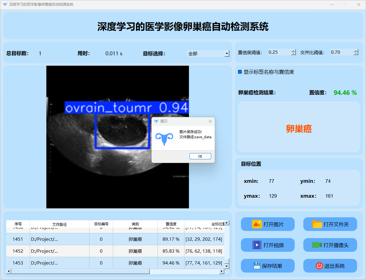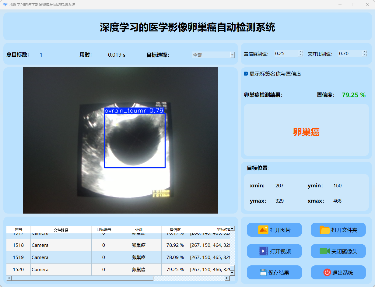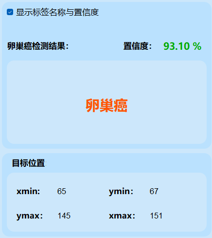 检测结果:系统成功识别并定位卵巢癌图像的目标情况,并输出包含总目标数、用时、目标类型、置信度及位置信息的详细检测结果。