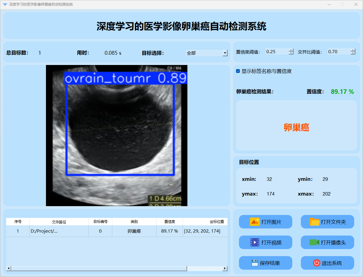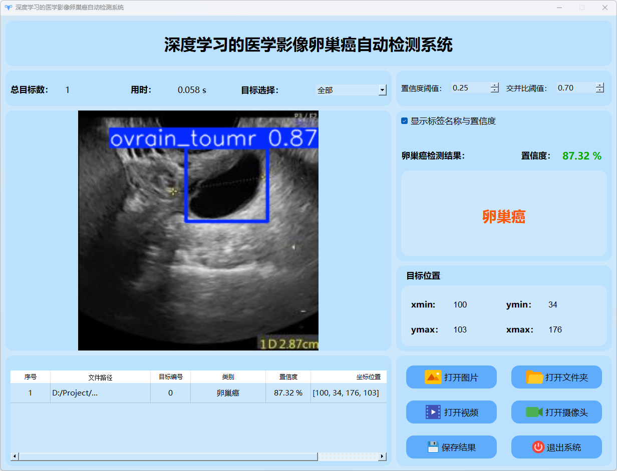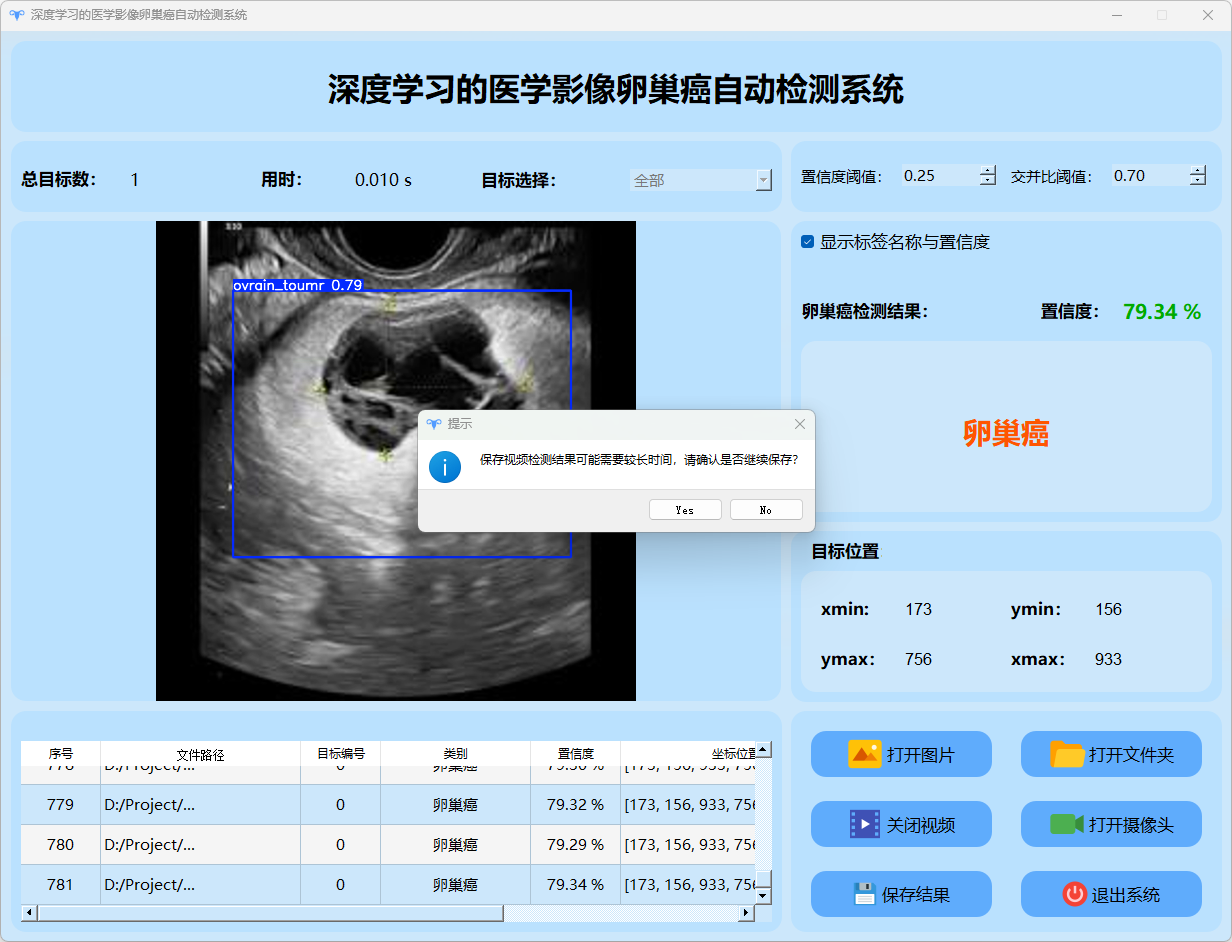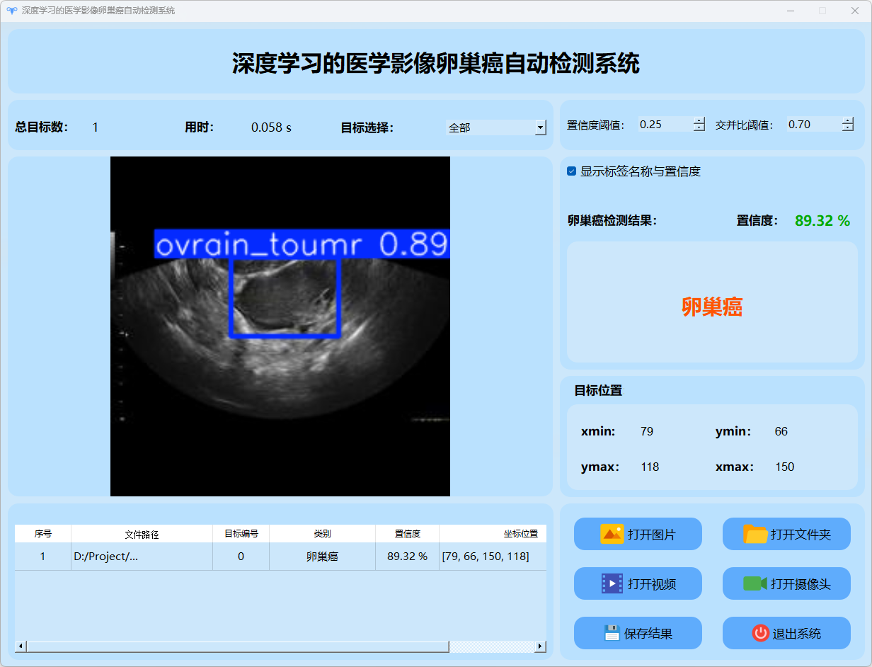 检测结果:系统成功识别并定位卵巢癌图像的目标情况,并输出包含总目标数、用时、目标类型、置信度及位置信息的详细检测结果。