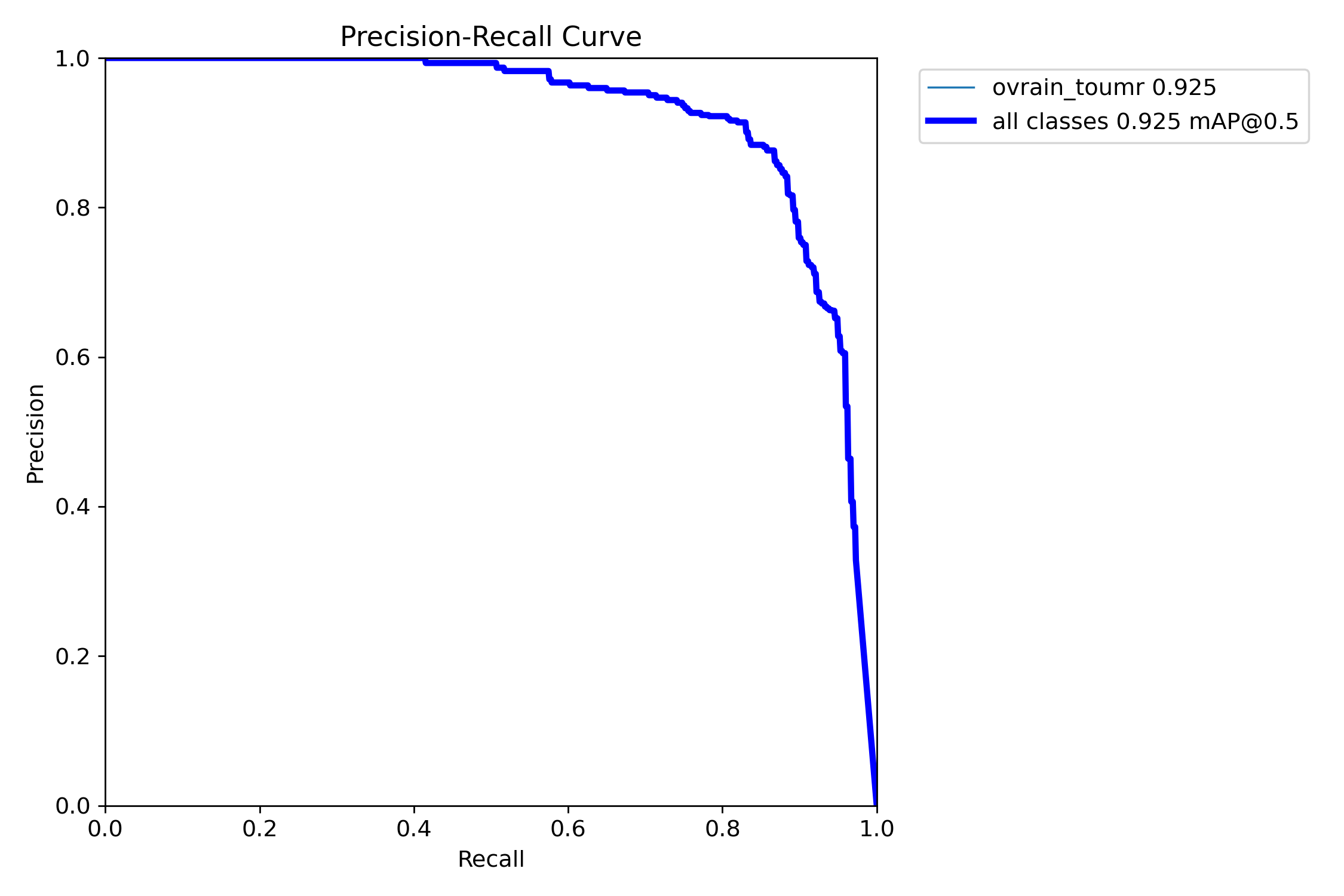 总结:该PR曲线清晰展示了模型在"ovrain_tournr"类别上的卓越表现,并且整体mAP@0.5指标同样展现出较高的准确性。