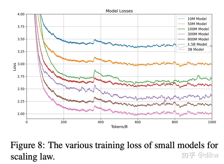 基于给定的数据集,在规模越大时(即参数数量越多),损失值会更低(即损失函数值减小)。令人意外的是,在处理至600B规模时,三个不同规模的模型实现了同步收敛。