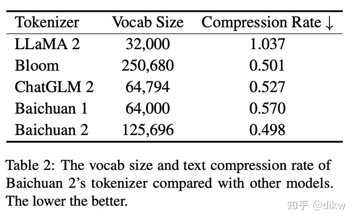 - 相较于其他模型,Baichuan 2 的分词器参数配置详尽列出了各项指标,其中值得注意的是,较低的文本压缩率更能满足实际需求。