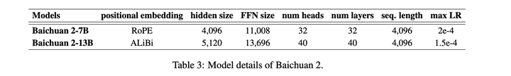 为了进一步推进基于偏置和基于乘法的注意力机制的研究工作,在实验平台Baichuan 2-7B模型中采用了RoPE位置编码方案,在Baichuan 2-13B模型中则采用了自适应线性插值注意力(ALiBi)机制,并保持与Baichuan 1模型的一致性