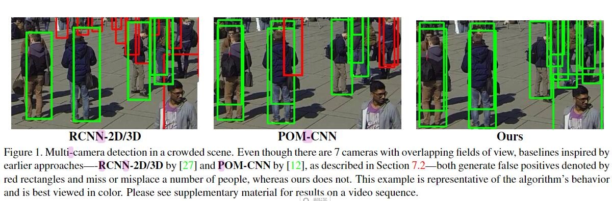 从那之后,基于深度学习的单镜头人物检测算法[23,19,28]已经成为最有效的算法[28]。然而,这些优秀的算法很少被用于MCMT。近期的一些算法,如[27],试图通过首先检测单个图像中的人,将检测映射到共同的参考帧中,并最终将它们对应以实现3D定位并消除误报。如图1所示,出于两个原因,这很容易出错。首先,参考帧中的映射是不准确的,特别是当二维检测器没有被专门训练时。其次,映射之前通常对2D检测器的输出进行非最大抑制(NMS),这没有考虑使用多相机的几何结构来解决歧义问题。