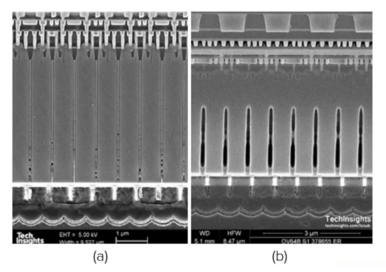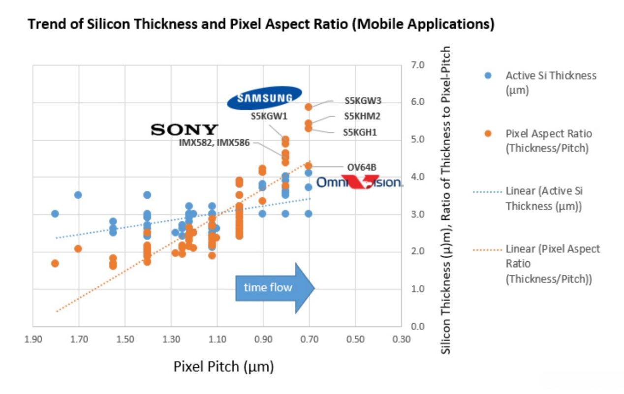 在Active Si厚度与像素尺寸比值方面表现最突出的CIS是三星GW3(如图所示)。该图像传感器具有6400万个像素及单像素尺寸为0.7微米的特点,并达成了active Si厚度为4.1微米的目标。对比的是Omnivision公司的OV64B芯片。值得注意的是,在智能手机市场中,这两款芯片都具有一定的代表性。