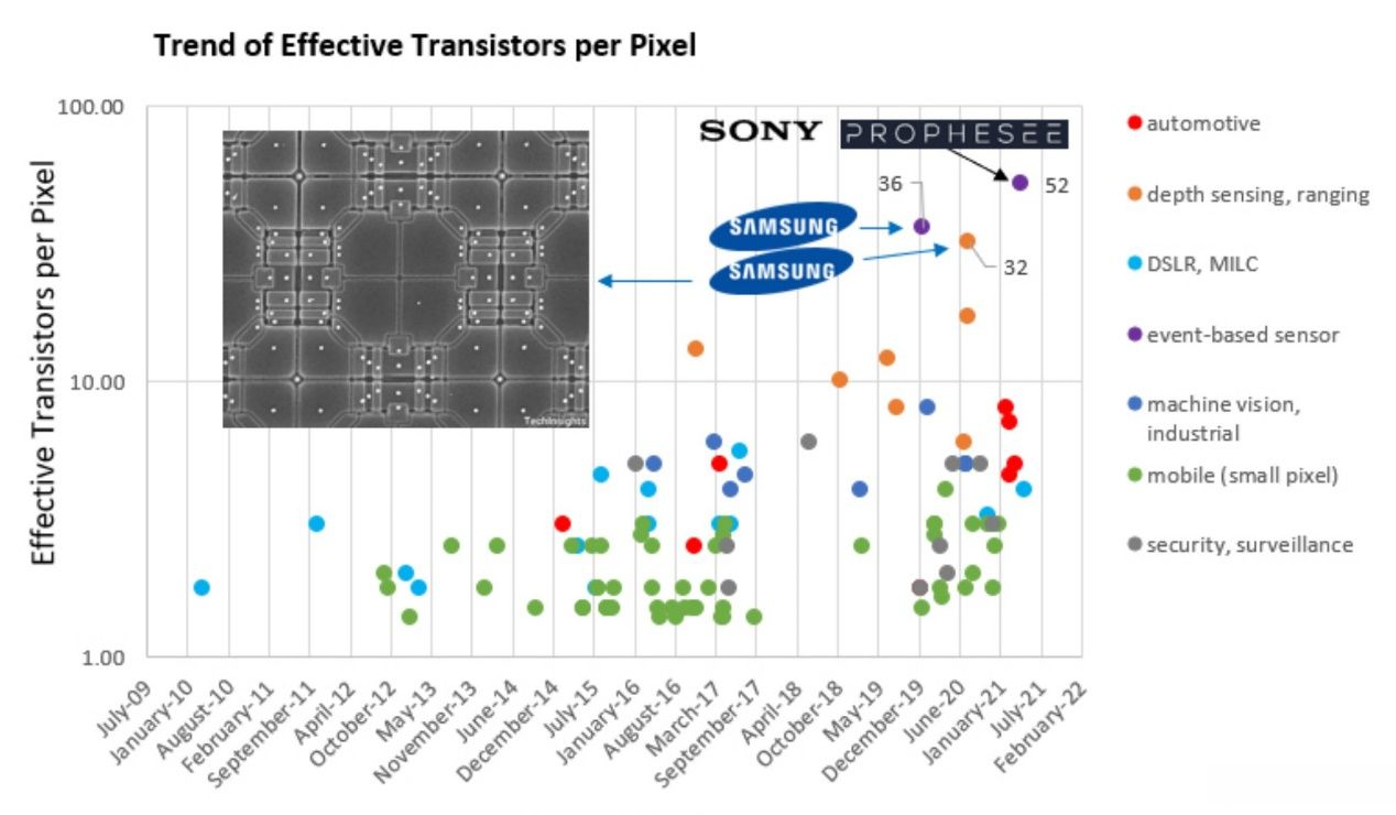 TechInsights在此次报告中引入了一个重要的统计维度Teff(每个像素的有效晶体管)。该研究不仅对不同应用场景下的常规CMOS感应器(CIS)进行了统计分析——包括手机、相机、汽车以及安防设备等;还对基于事件驱动型传感器以及ToF(时间-of-Flight)等特殊类型的图像和视觉传感器进行了详细统计分析。