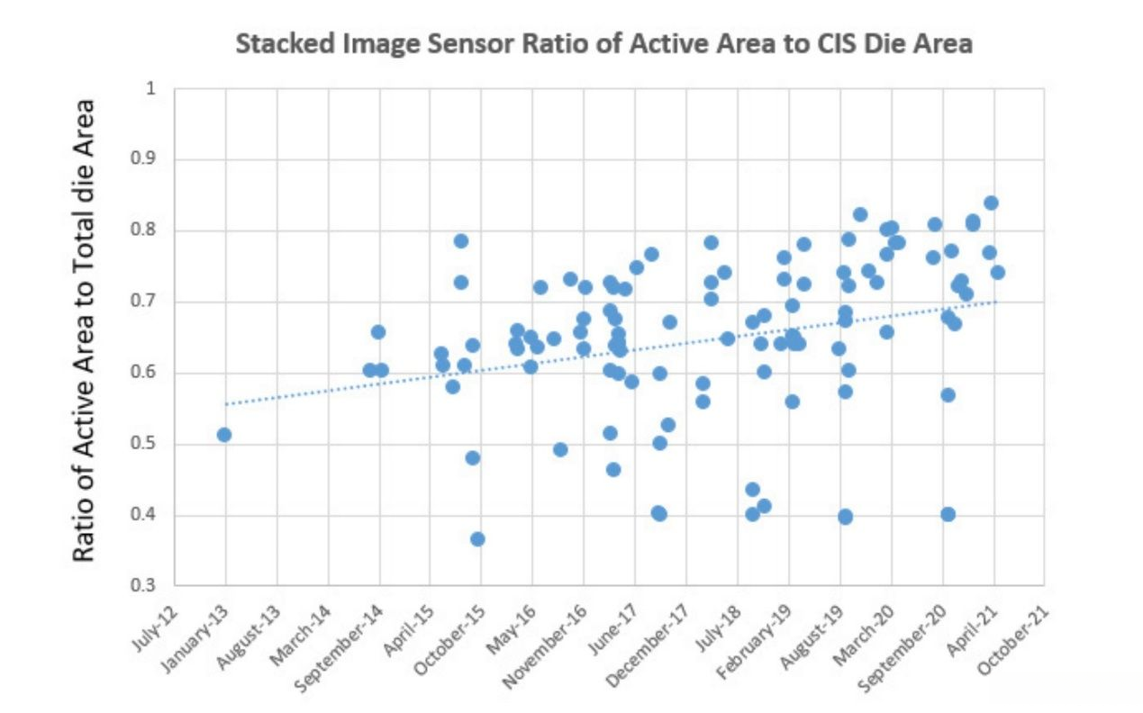 该图表记录了自2013年以来叠合式CIS芯片领域中活跃使用的感光像素区域与整体芯片面积的比例关系。总体呈现出持续增长的趋势,在过去两年里这一比例已显著提升至80%以上。