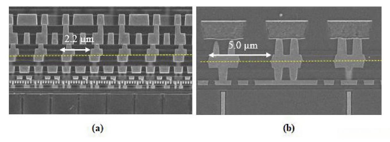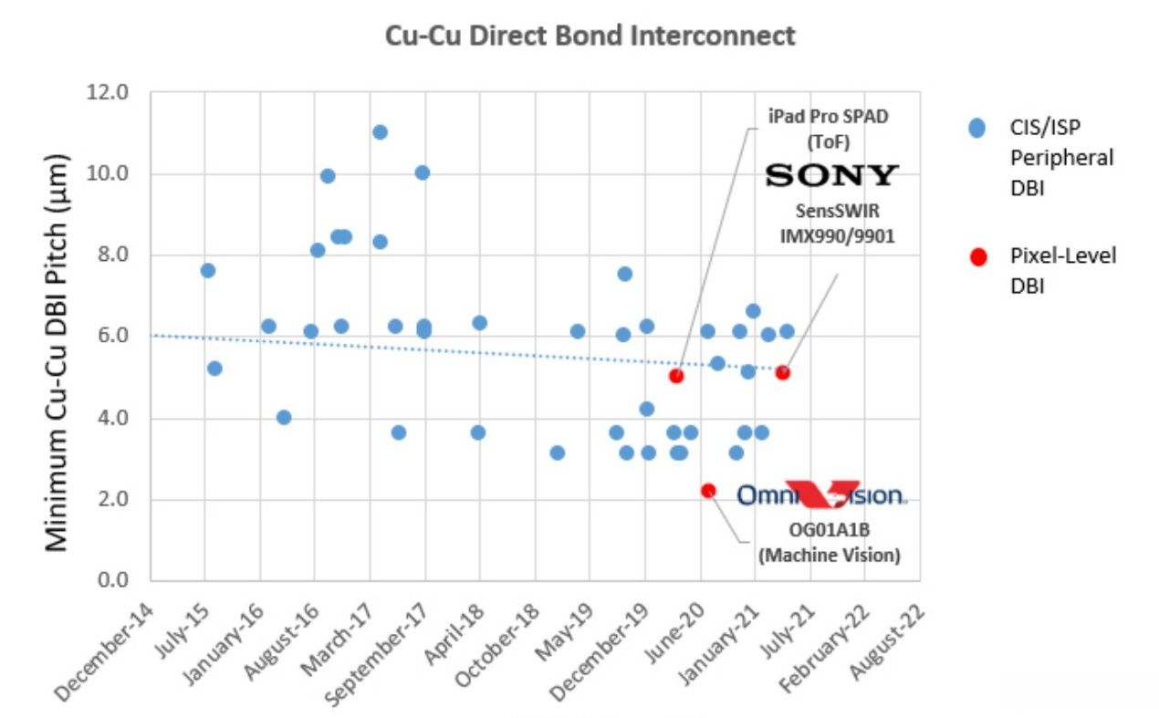 其中Omnivision OG01A1B的DBI互联间距最小,达到了2.2μm(上图左)。
