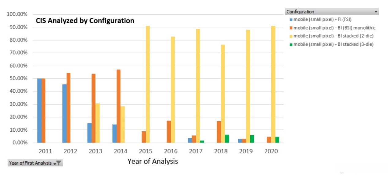 从广泛认可的重要领域来看,移动成像CIS技术的发展热点主要集中在背照式(BSI)与堆栈式(Stacked)结构上。根据TechInsights的数据表明,在手机CIS市场中,采用背照式与堆栈式的组合所占的比例高达约90%。