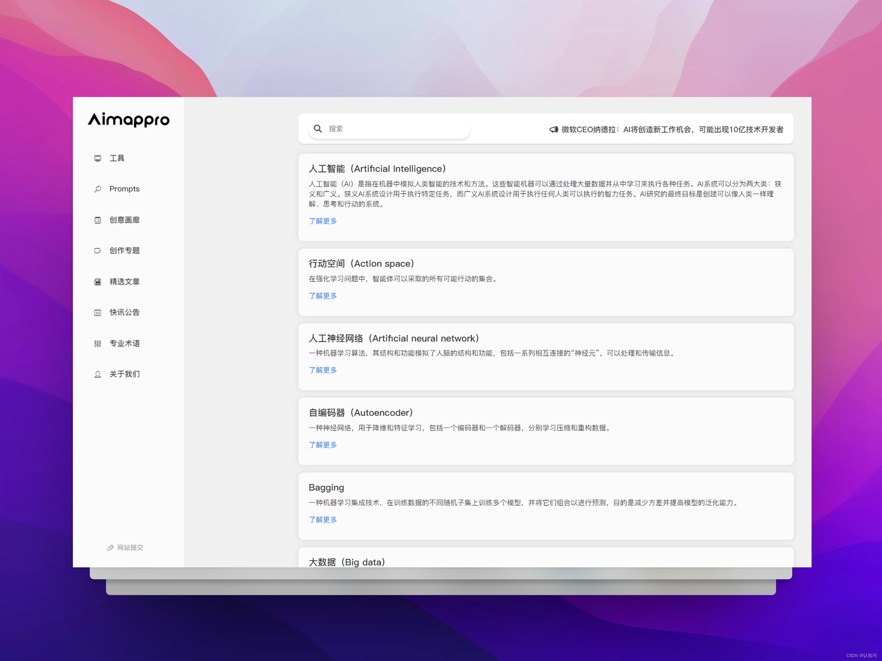 AI专业术语:AiMapPro平台提供了丰富的核心概念学习资源库,旨在助力用户全面深入地掌握和深入理解人工智能领域的关键术语与核心技术。
