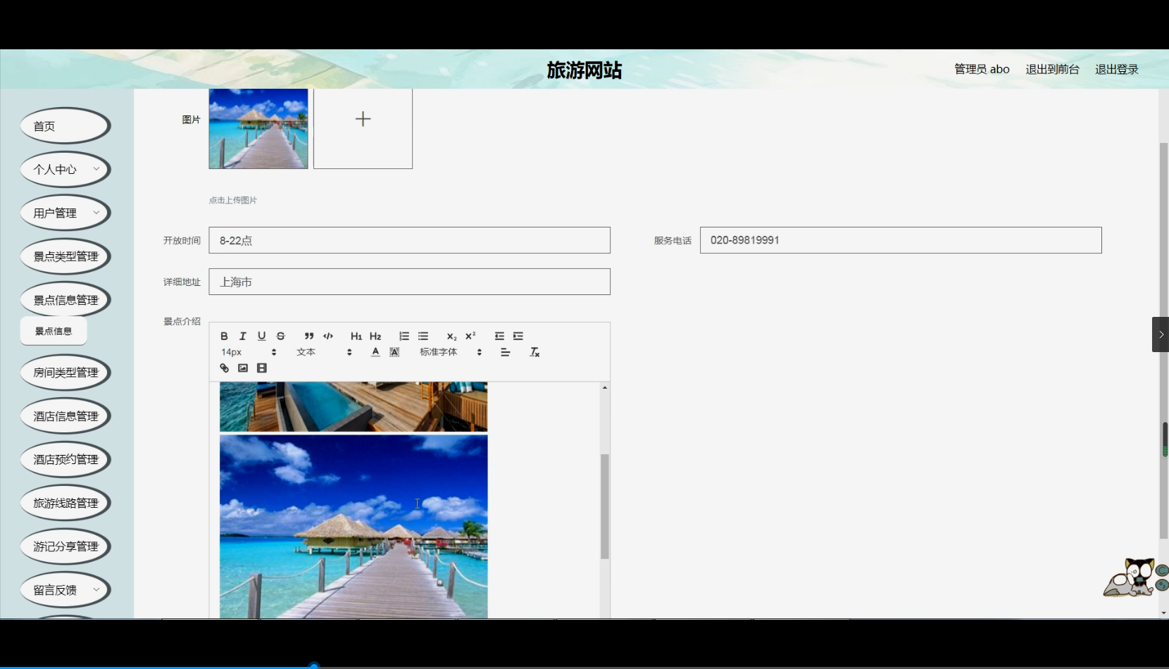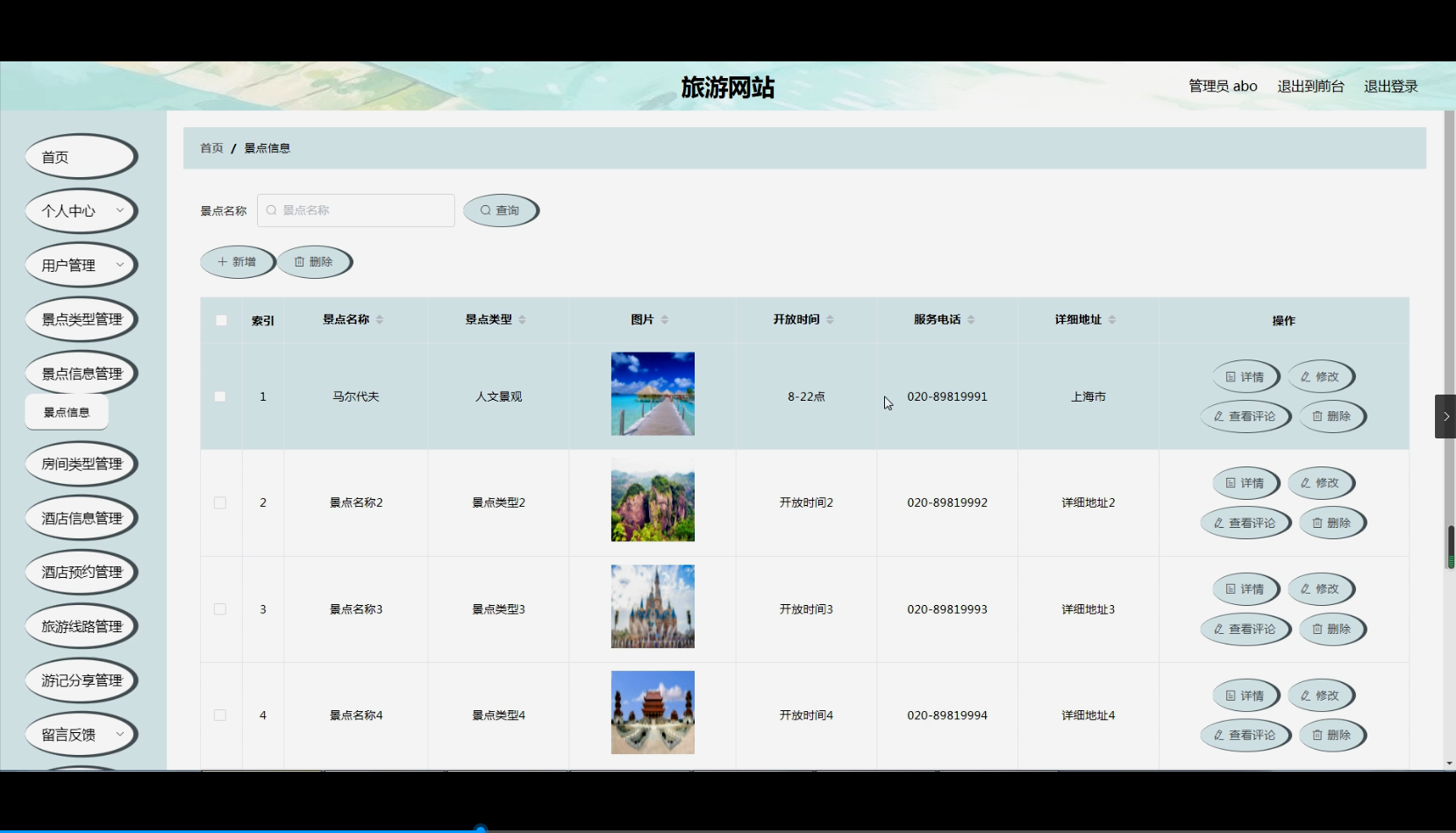 - 景点相关功能 :全面展示各类景点信息,并对景点特色(如自然景观、人文景观等)、开放时间、门票价格等关键指标进行详细呈现。
